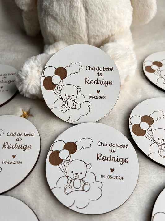 Lembrança de Baby shower em formato de disco com tema urso e balões