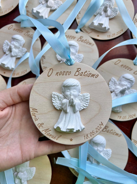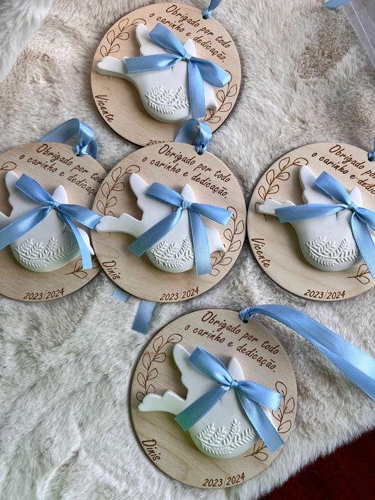 Lembrança com base de madeira e pomba de gesso perfumado para Educadoras/ Auxiliares / Professoras