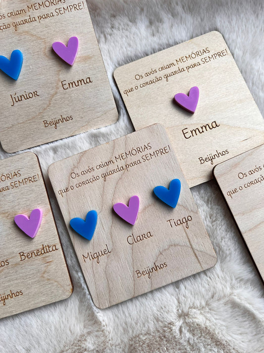 Íman em Madeira com Corações em Acrílico — Presente para Avós com Nome dos Netos