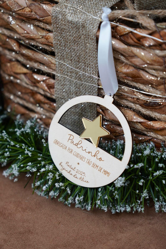 Pendente de Natal em Bétula com Estrela em Acrílico – Presente para Padrinhos, Madrinhas, Professores e Família