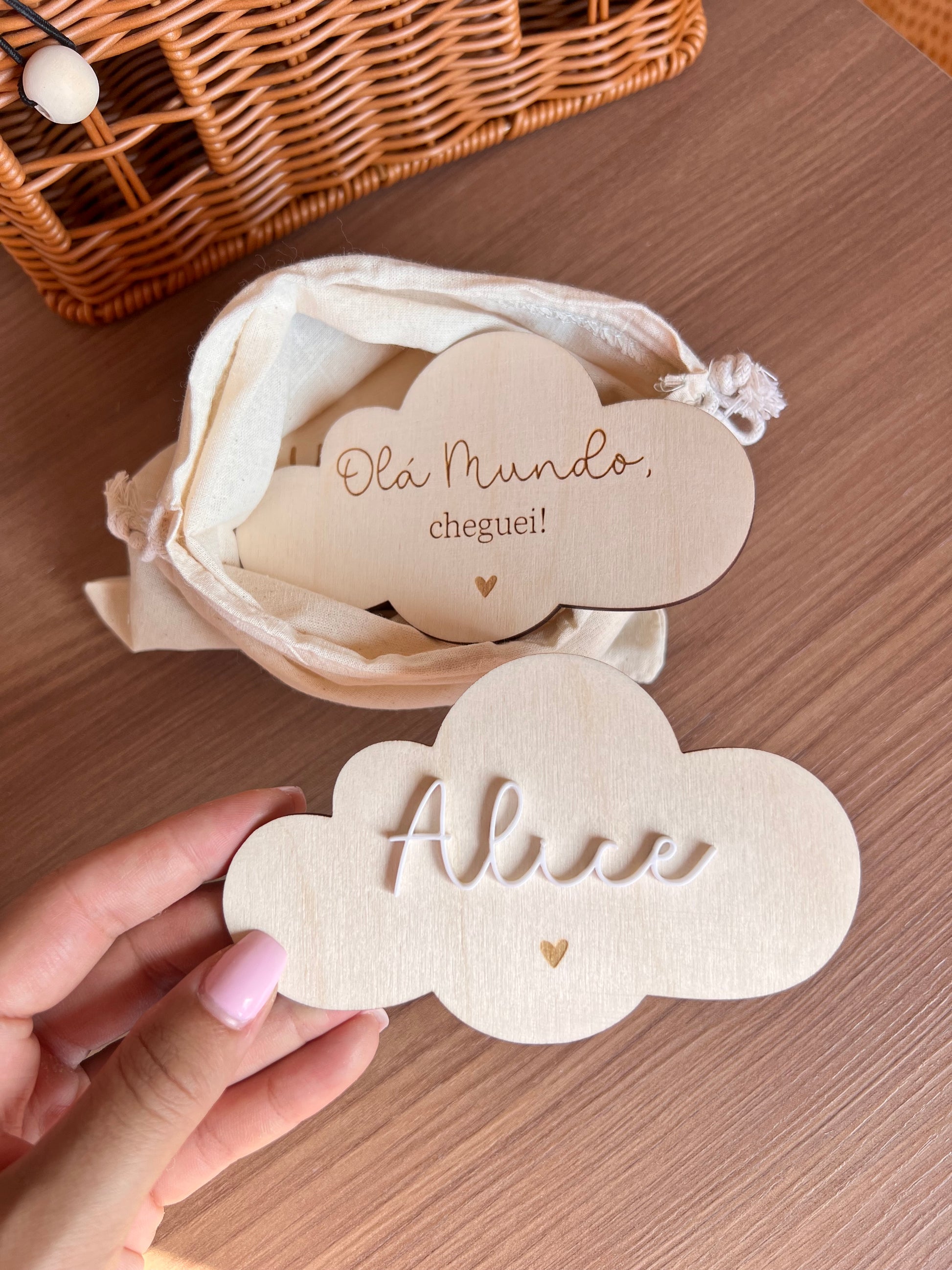Cada placa tem o formato de nuvem com um tamanho aproximando de 12,6x 7,7cm. O conjunto inclui a placa de nome, a placa “Olá Mundo, cheguei!” e os doze meses.