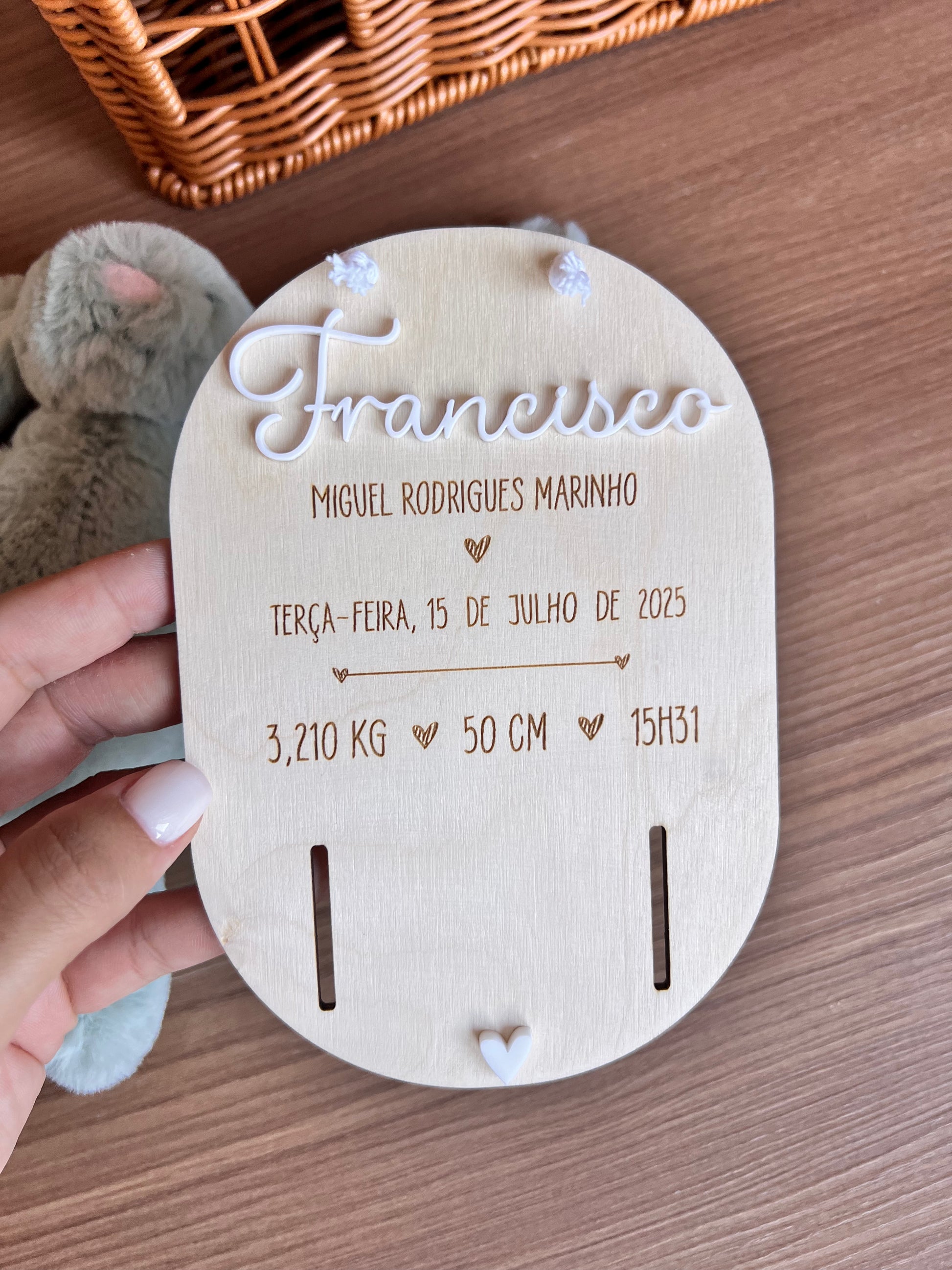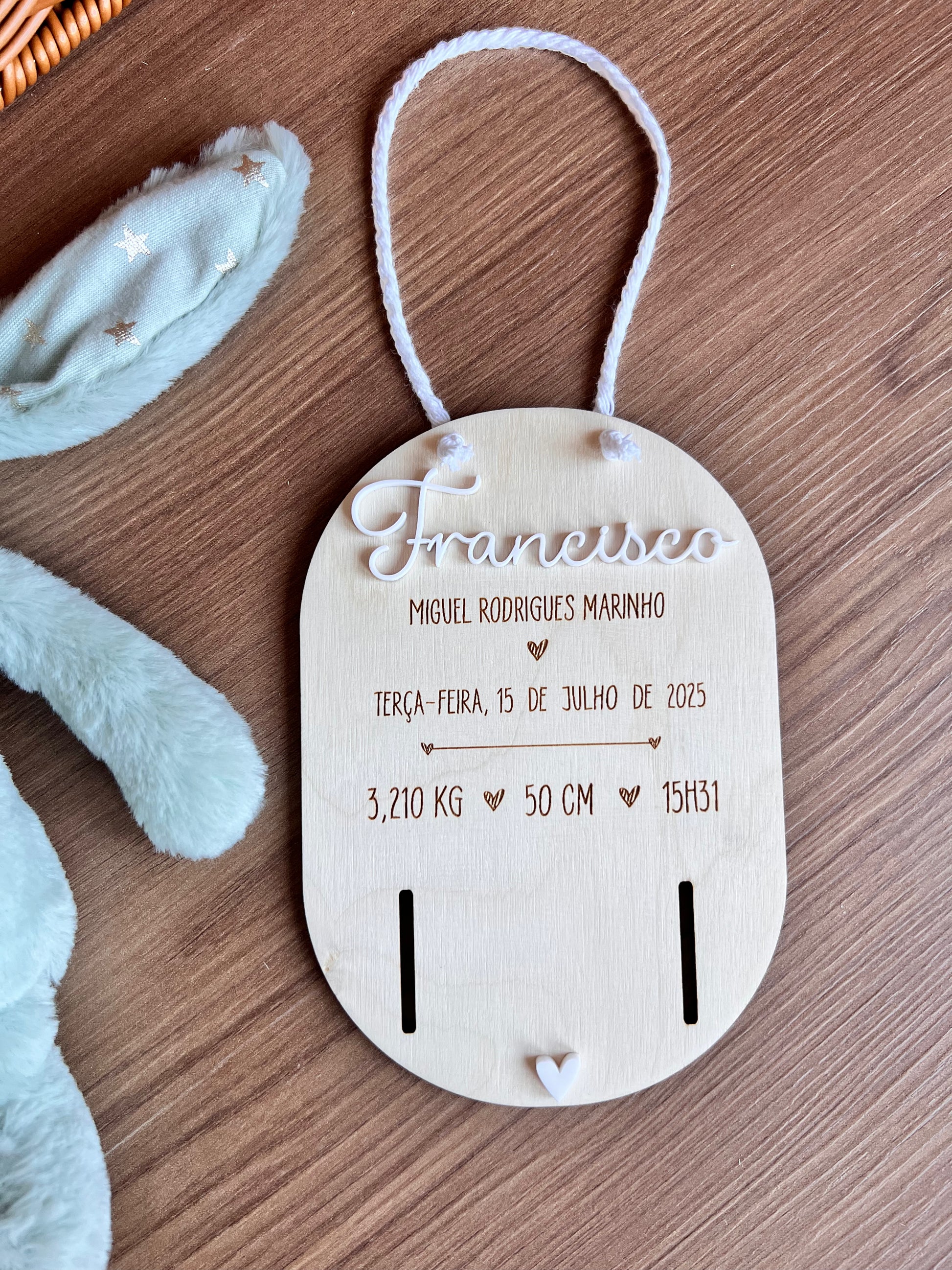 A nossa plaquinha elegante e minimalista para registrar os dados de nascimento do bebé.